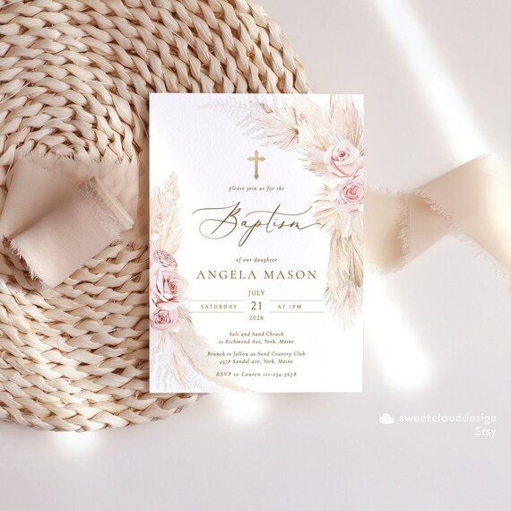 Boho Blush Baptism Invitation Template Girl Blush Floral Etsy